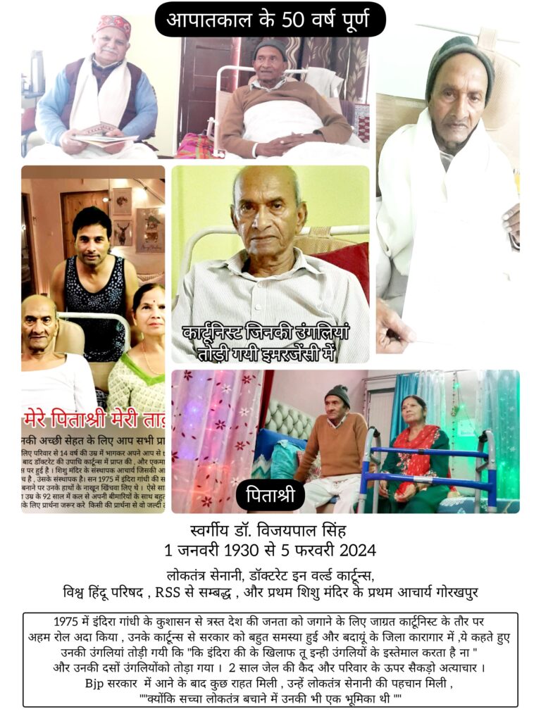 1975 में इंदिरा गांधी के कुशासन से त्रस्त देश की जनता को जगाने के लिए जाग्रत कार्टूनिस्ट के तौर पर अहम रोल अदा किया, उनके कार्टून्स से सरकार को बहुत समस्या हुई और बदायूं के जिला कारागार में, ये कहते हुए उनकी उंगलियां तोड़ी गयी कि “कि इंदिरा की के खिलाफ तू इन्ही उंगलियों के इस्तेमाल करता है ना ” और उनकी दसों उंगलियोंको तोड़ा गया। 2 साल जेल की कैद और परिवार के ऊपर सैकड़ो अत्याचार । Bjp सरकार में आने के बाद कुछ राहत मिली, उन्हें लोकतंत्र सेनानी की पहचान मिली, “क्योंकि सच्चा लोकतंत्र बचाने में उनकी भी एक भूमिका थी.