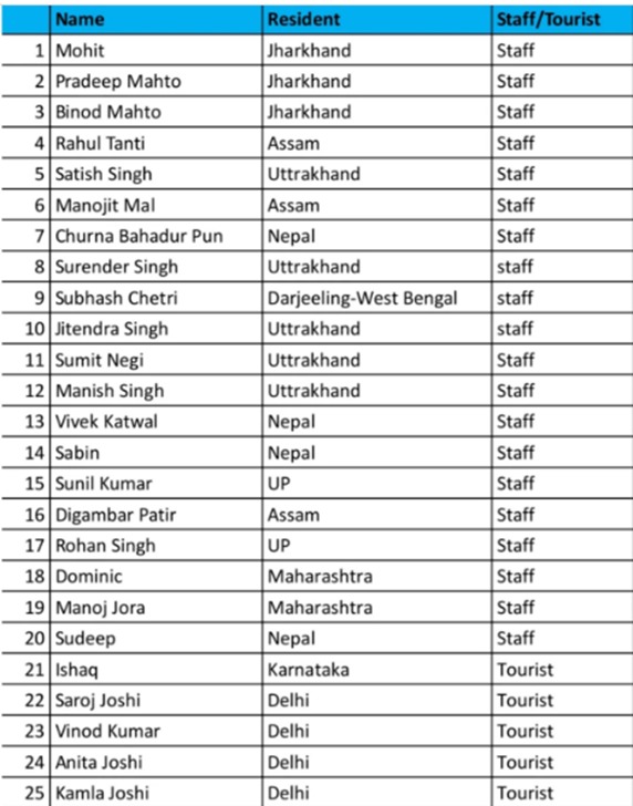 • कर्मचारी मृतकों में विभिन्न राज्यों से आए लोग शामिल हैं — इनमें कई उत्तराखंड, झारखण्ड, महाराष्ट्र, नेपाल आदि निवासी हैं।