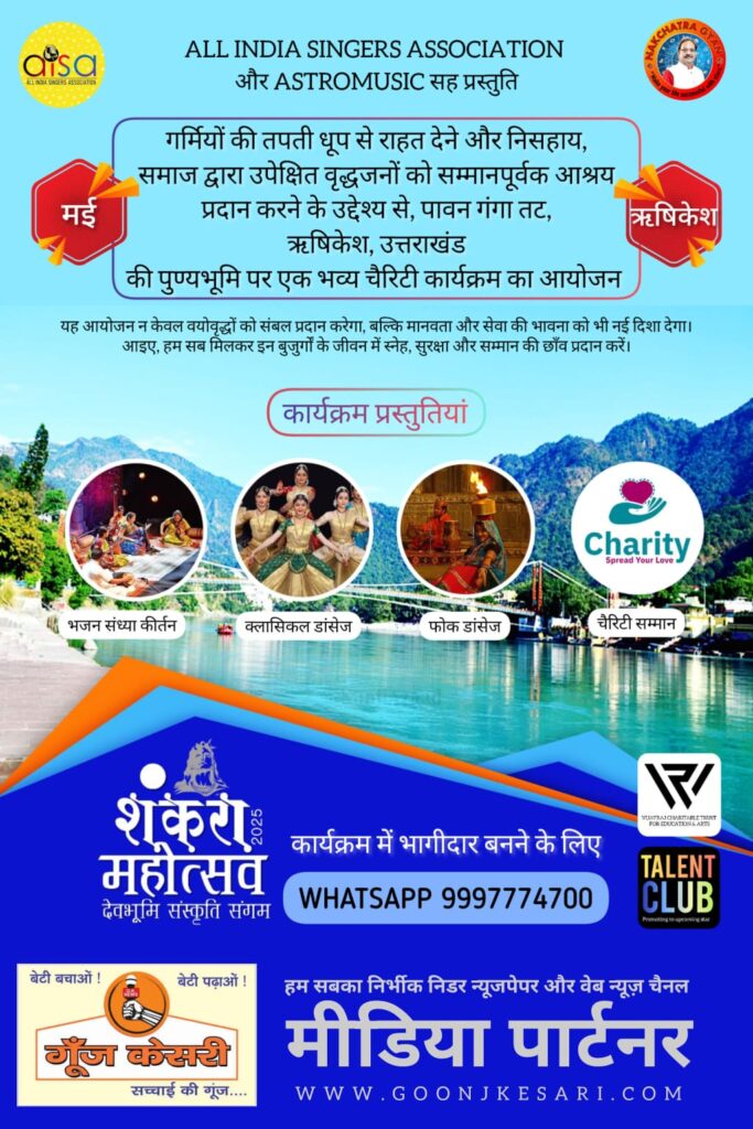 यह आयोजन *ऑल इंडिया सिंगर्स एसोसिएशन (AISA) और एस्ट्रो म्यूजिक* के सहयोग से एक *विशुद्ध चैरिटी कार्यक्रम* के रूप में किया जा रहा है, जिसका उद्देश्य नवोदित कलाकारों को मंच देना और जरूरतमंद वृद्धजनों को सहयोग प्रदान करना है।